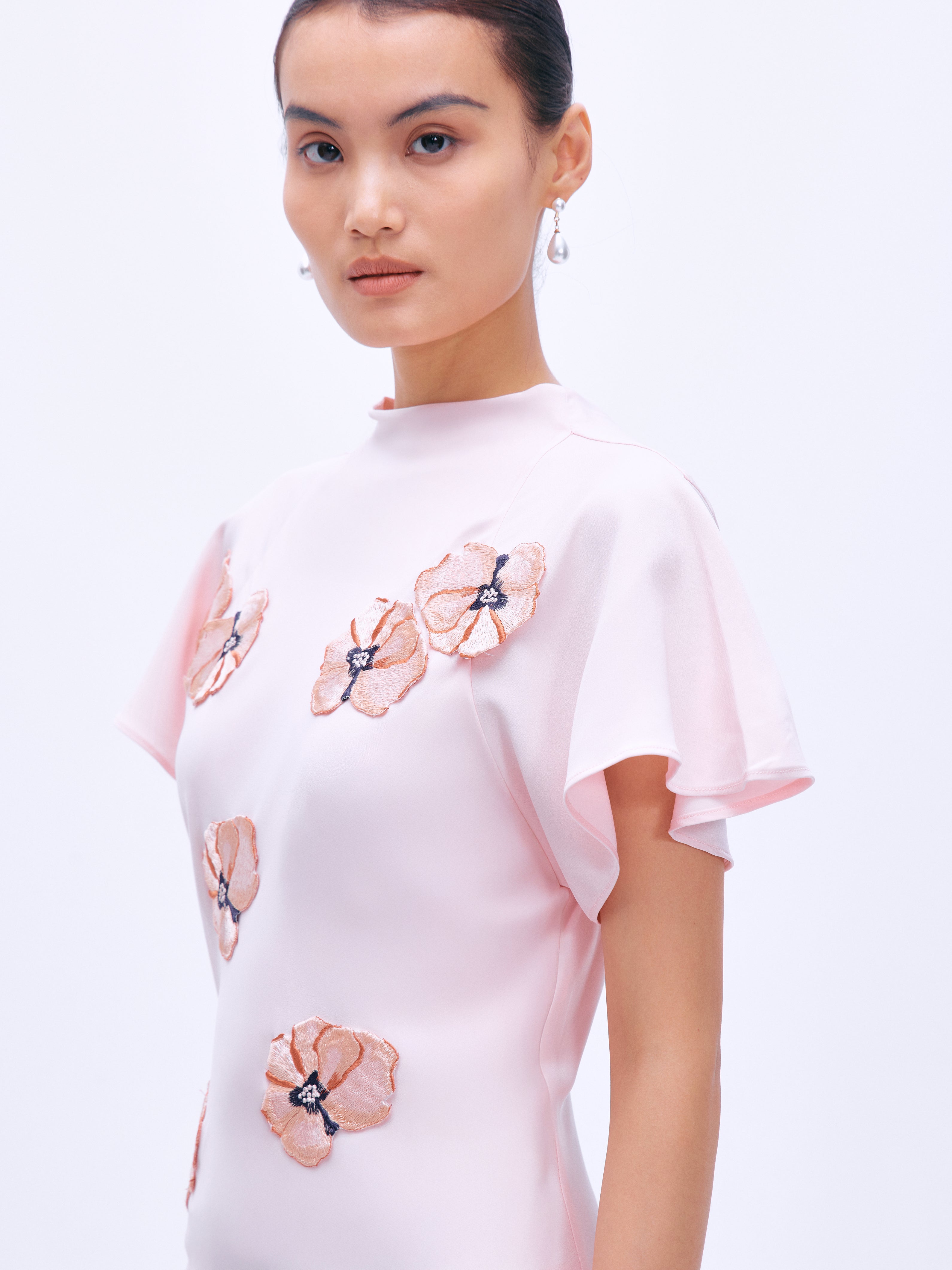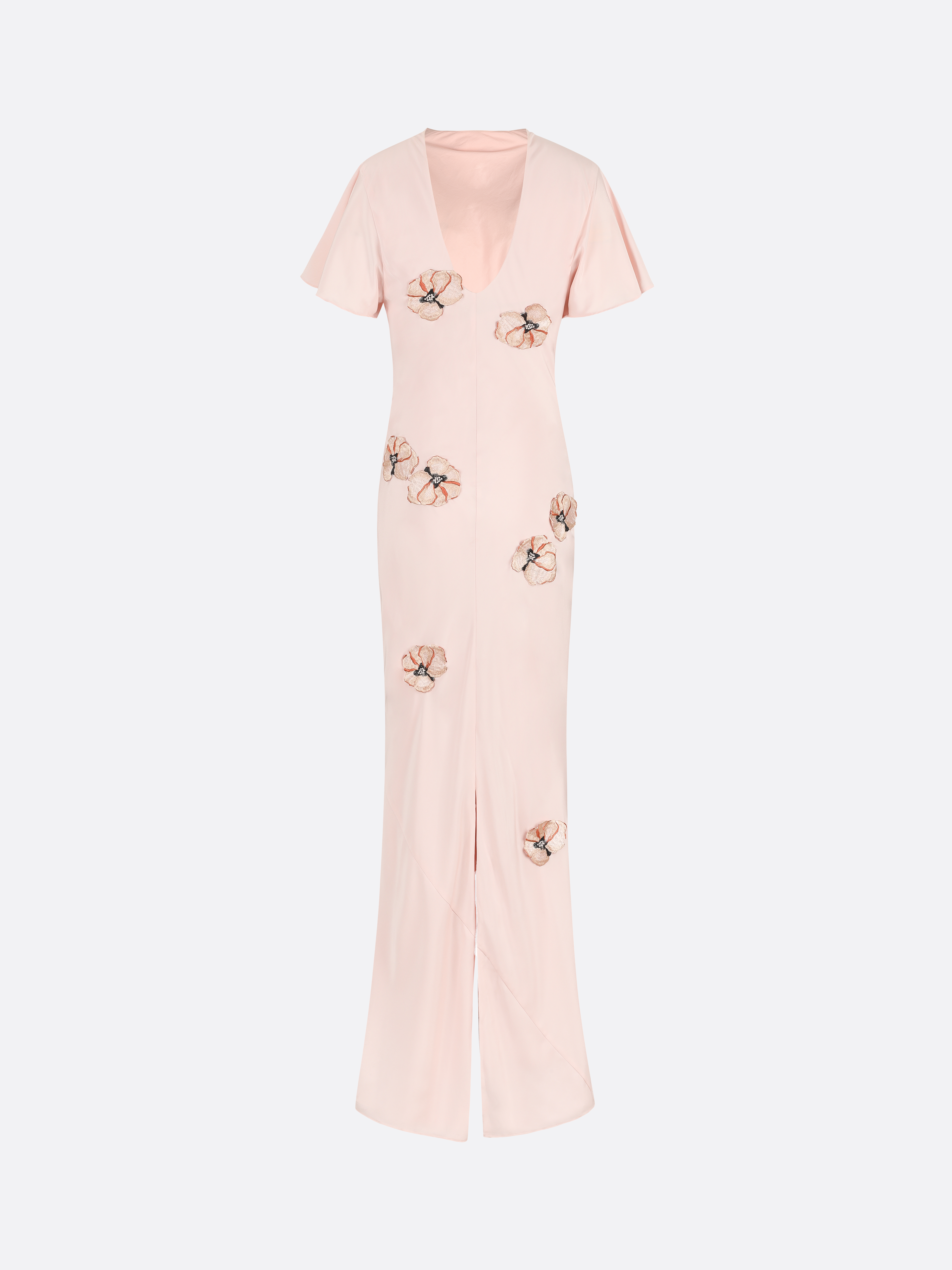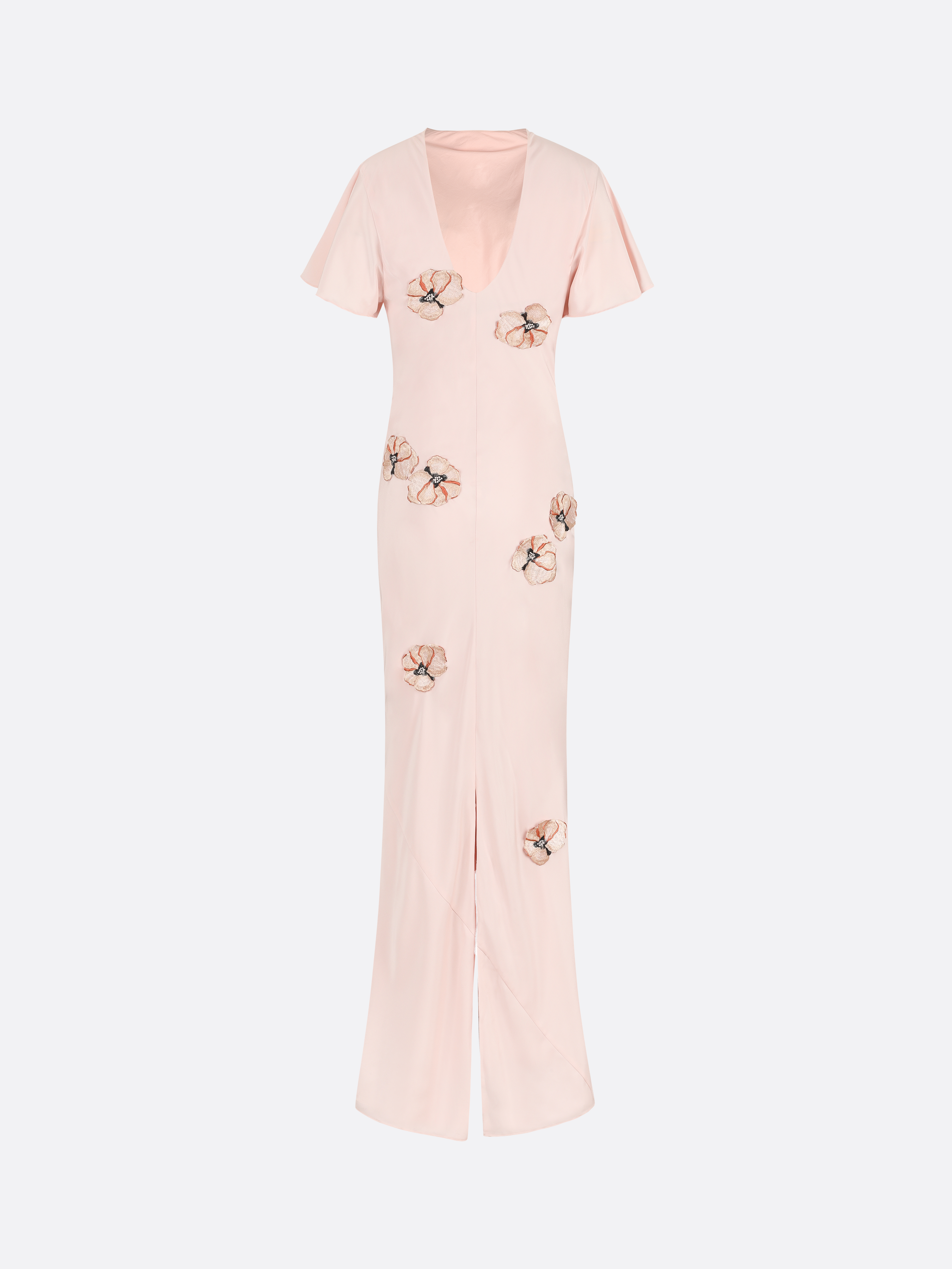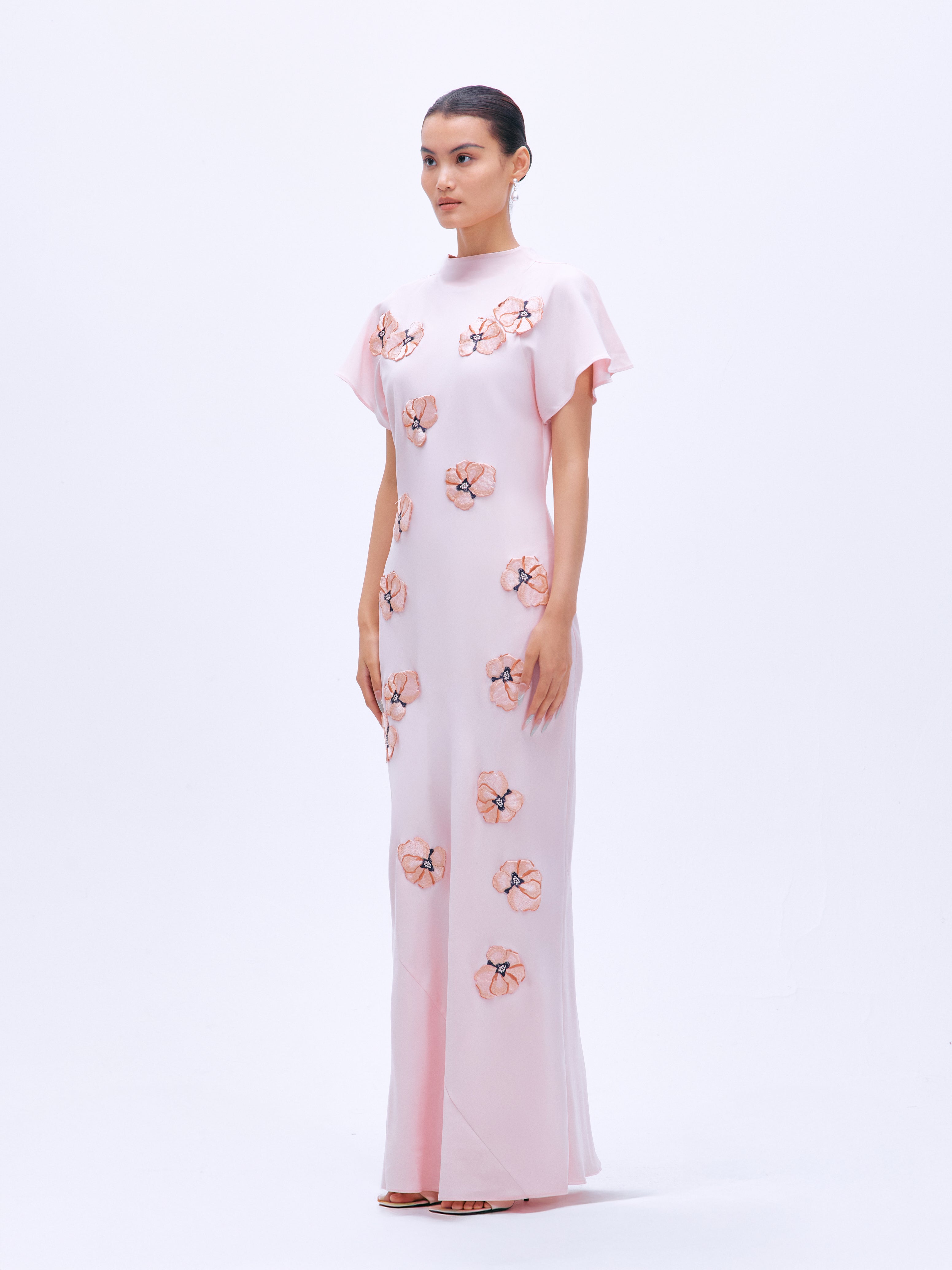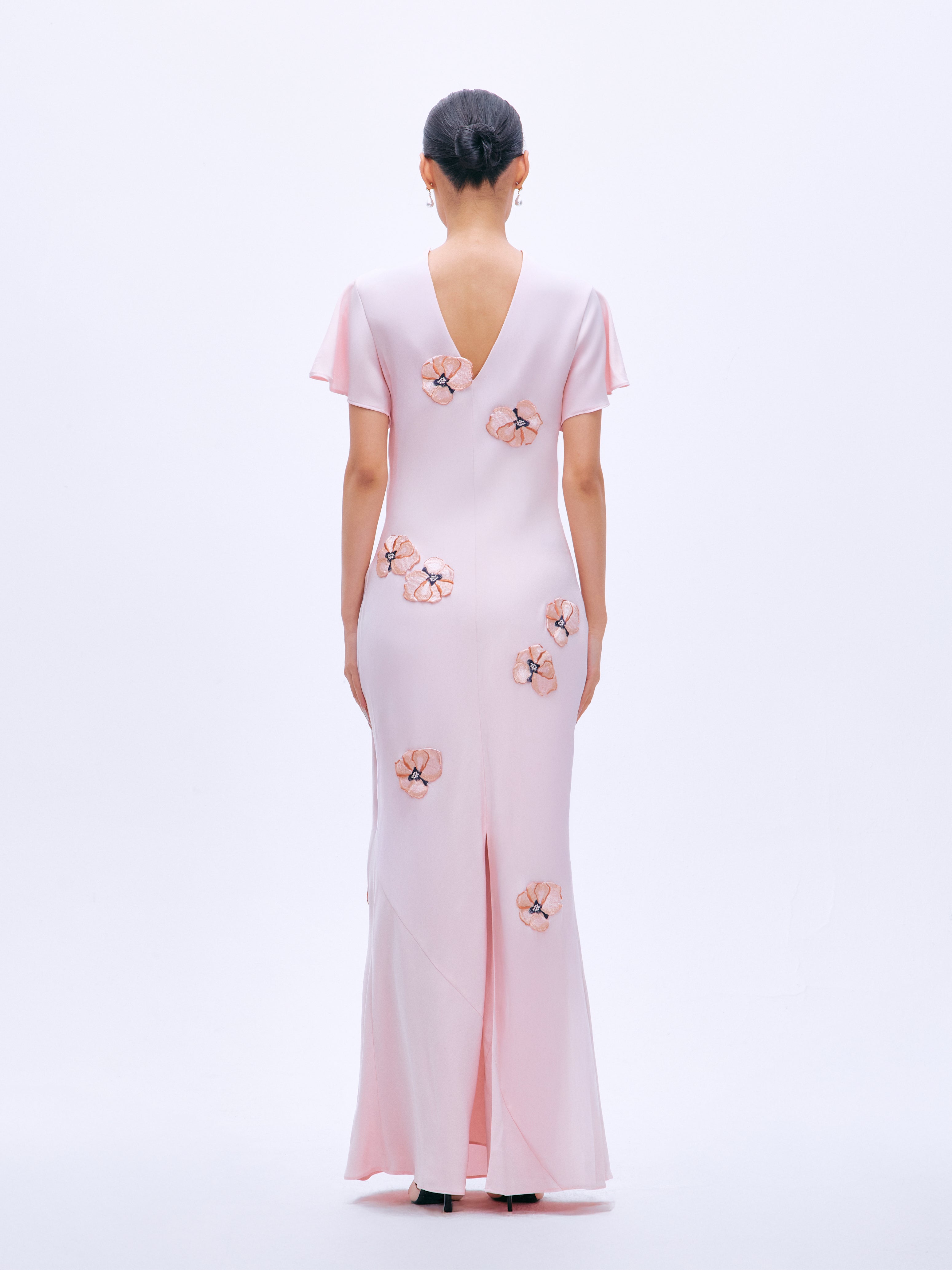 A floor-length skirt in the color Cherry Blossom Pink. Silk viscose with exquisitely arranged three-dimensional embroidered appliqués with delicate flutter sleeves, a back V-neckline and a skirt slit. Panelling added for a flowing mermaid hem.