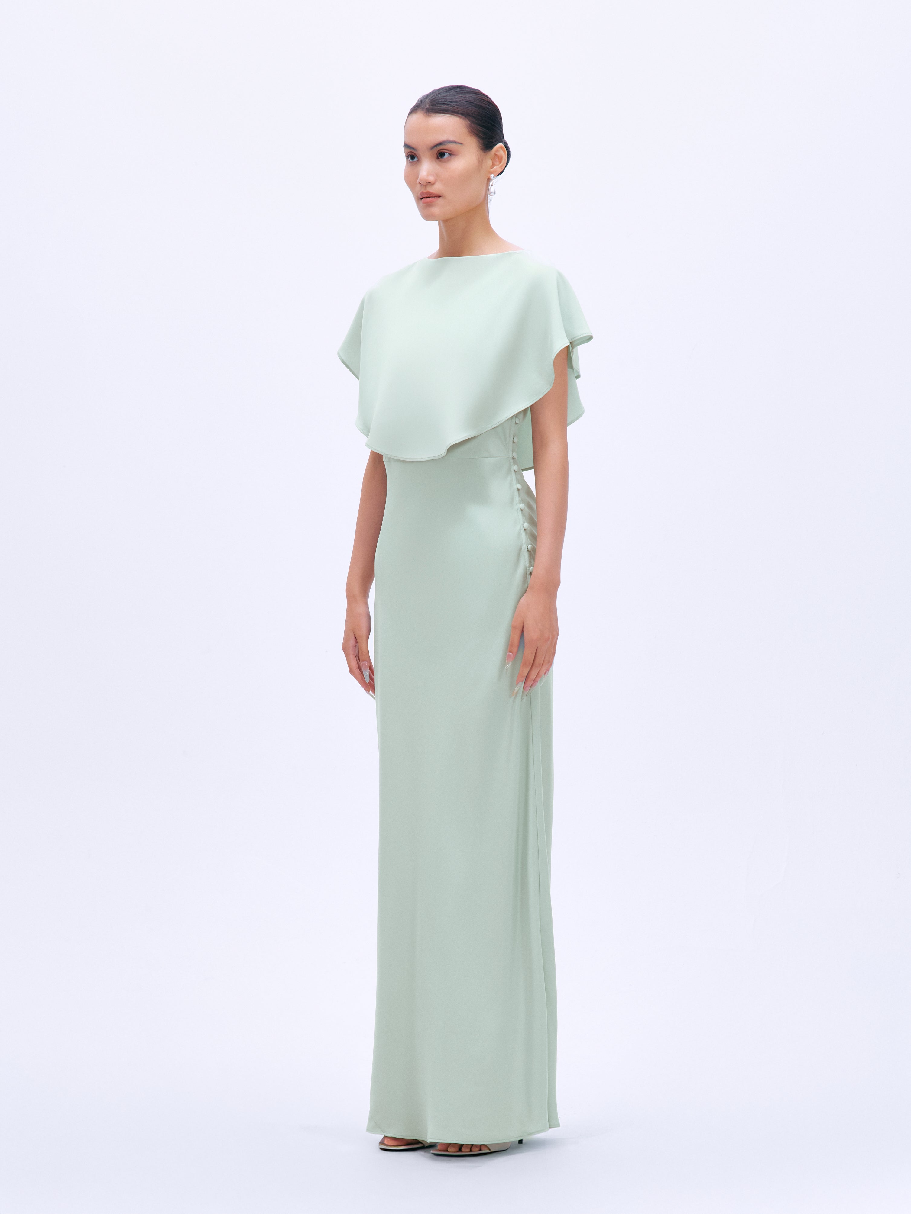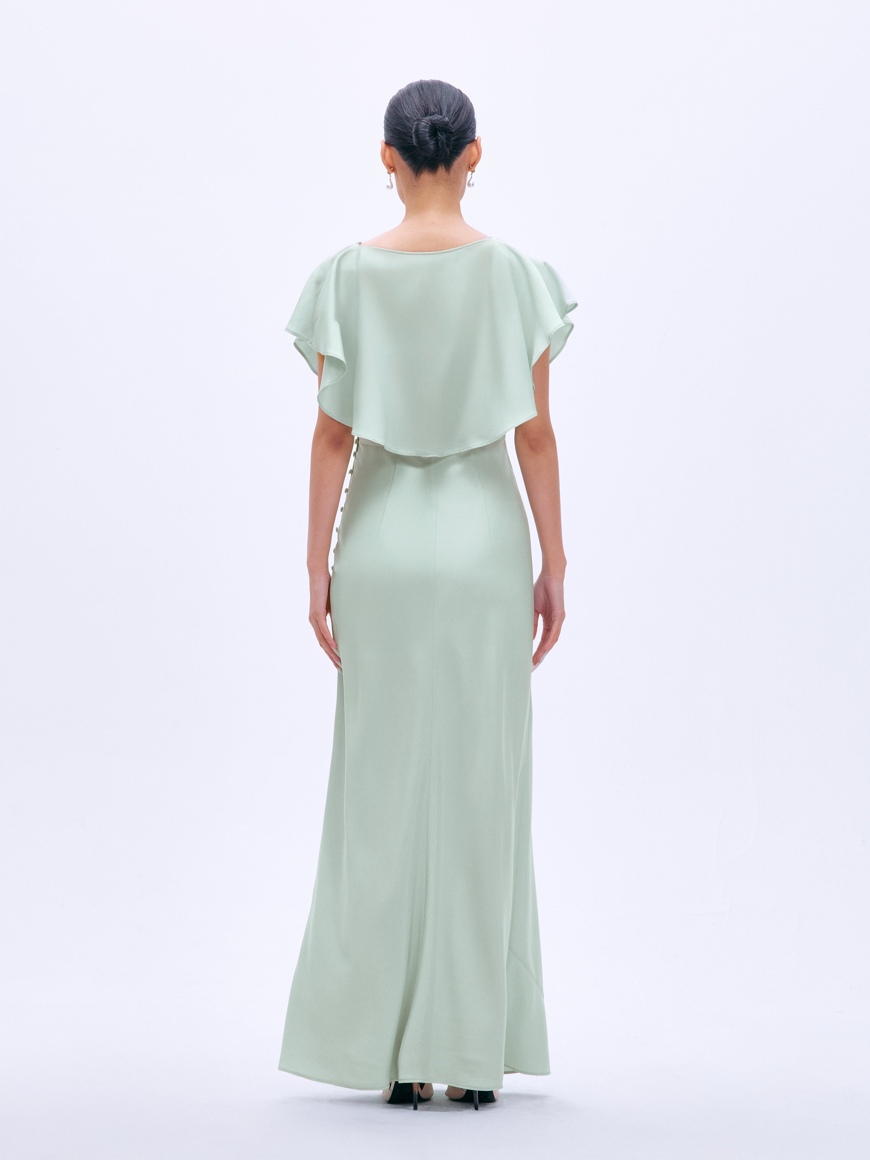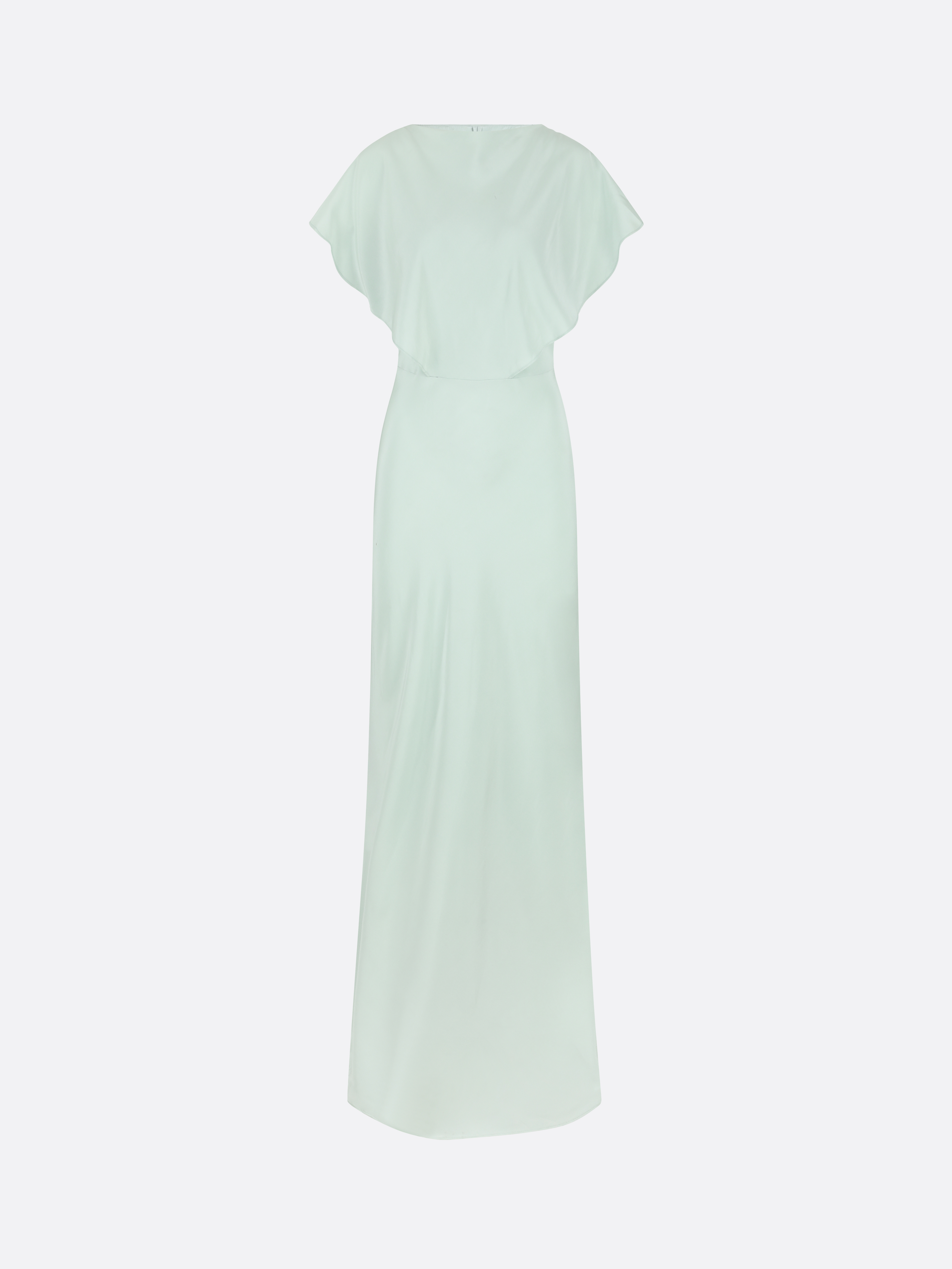 A floor-length dress in the color Serpentine Green. Silk viscose with an A-line silhouette and cape-inspired ruffled detailing. Bias-cut craftsmanship with a refined and composed silhouette through a tailored back and structured front panel.