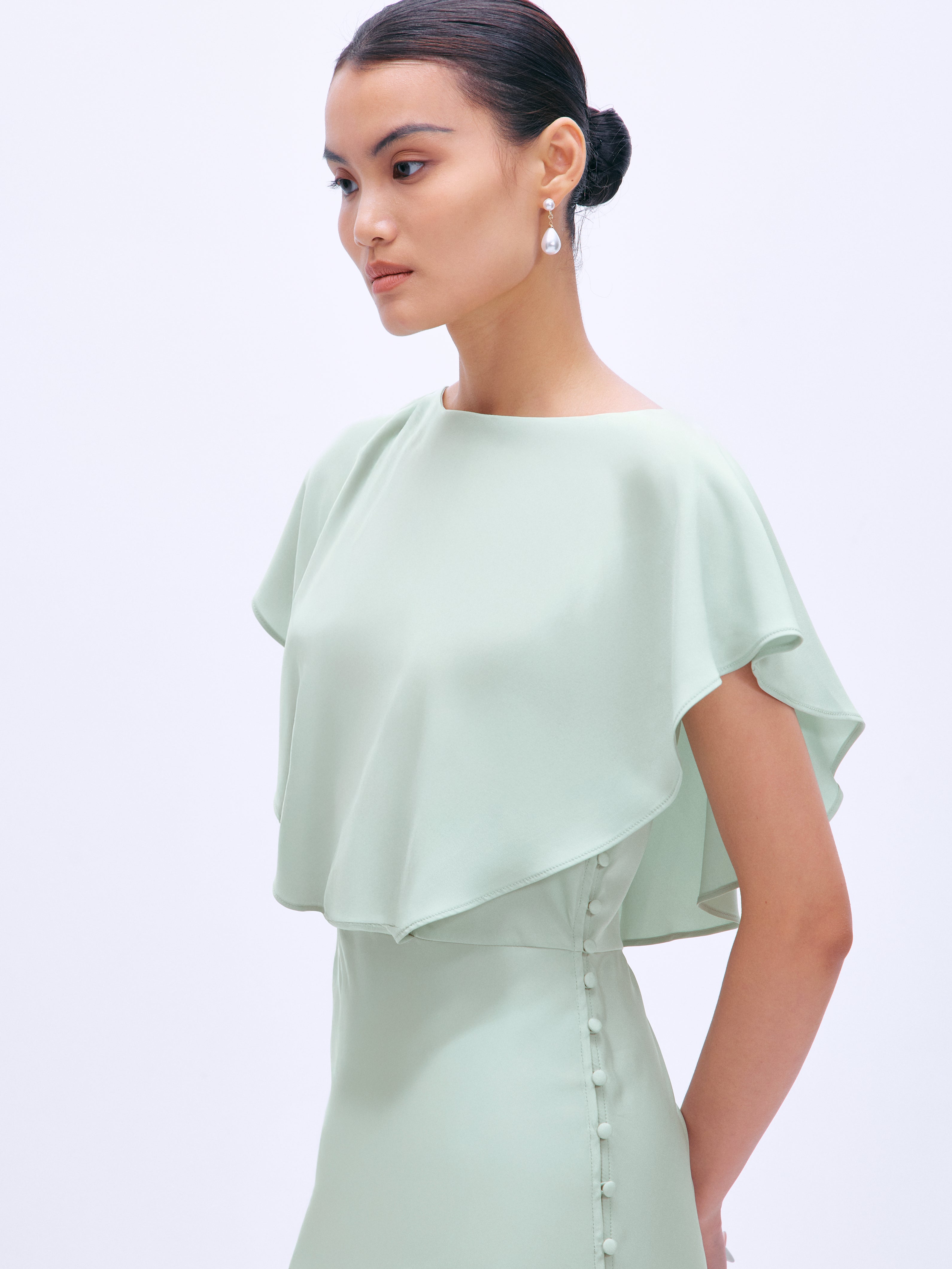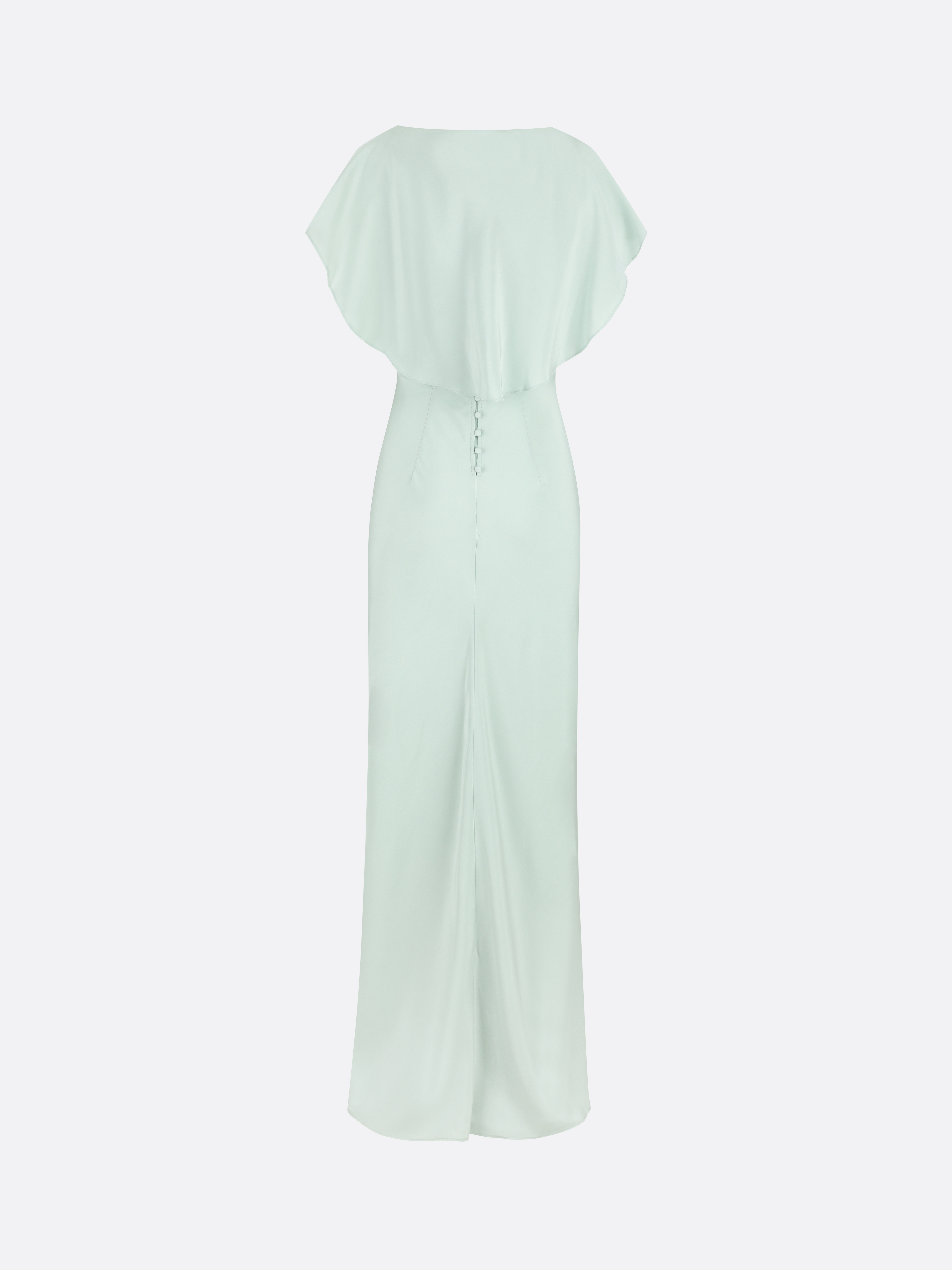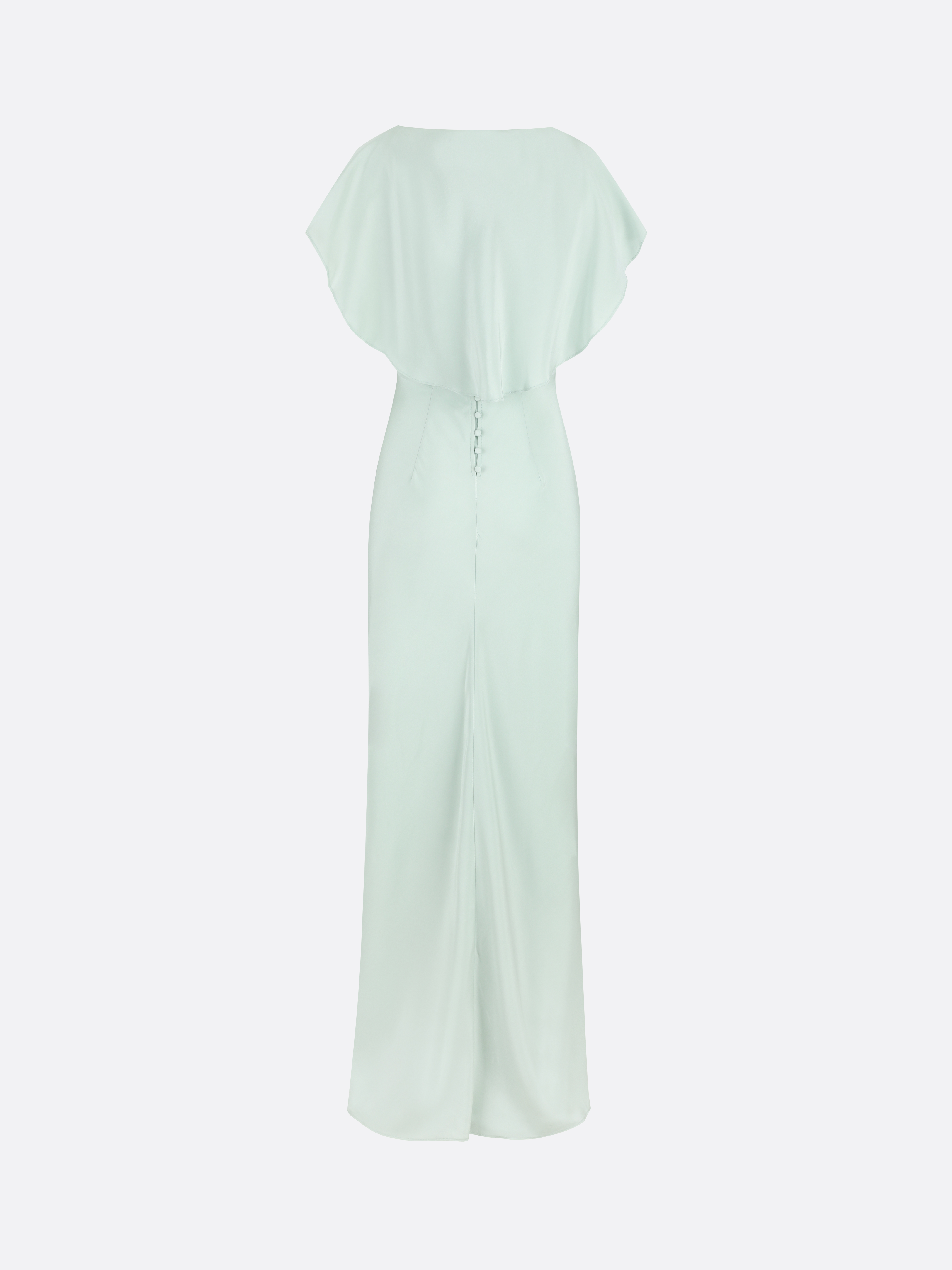 A floor-length dress in the color Serpentine Green. Silk viscose with an A-line silhouette and cape-inspired ruffled detailing. Bias-cut craftsmanship with a refined and composed silhouette through a tailored back and structured front panel.