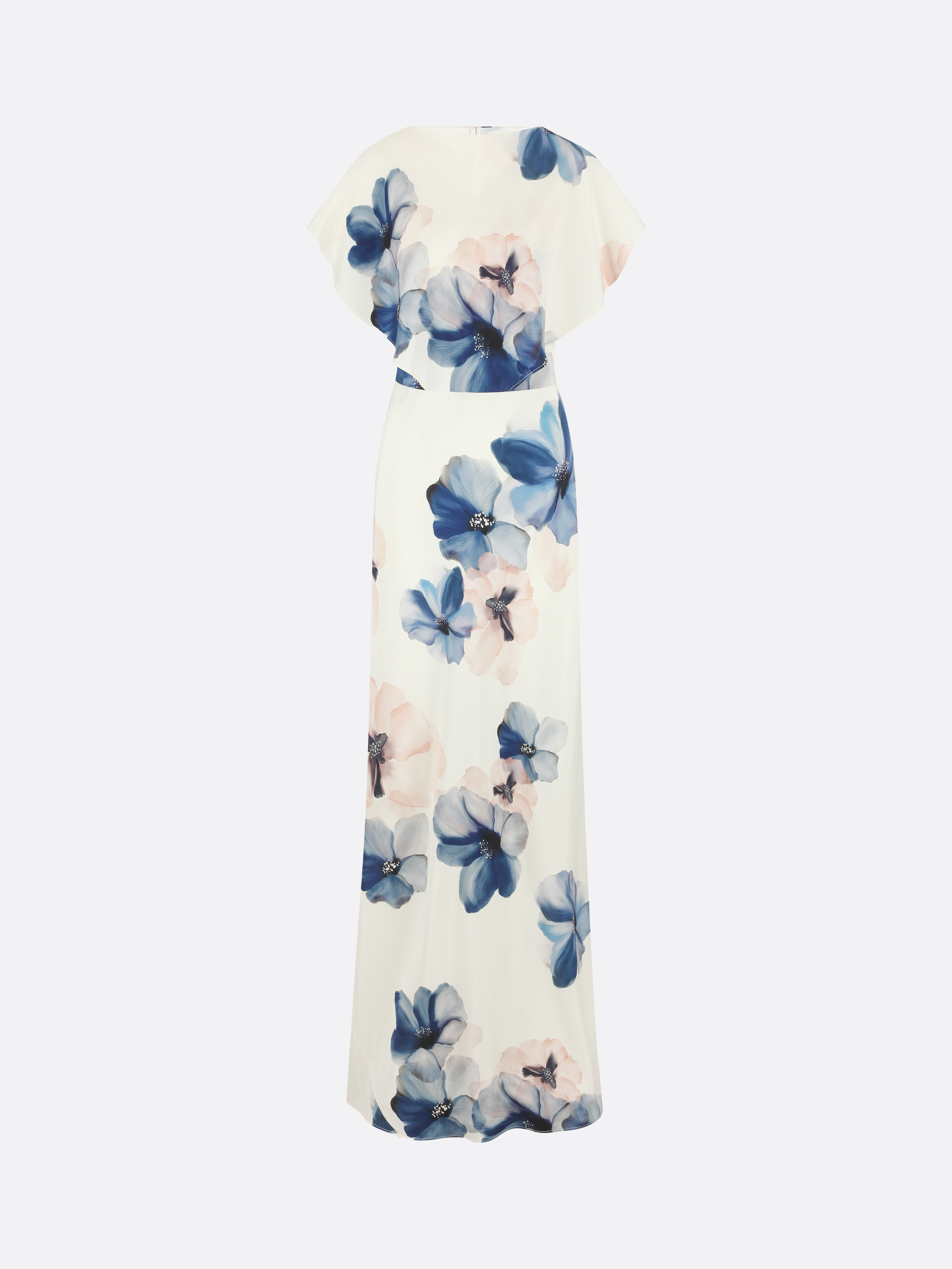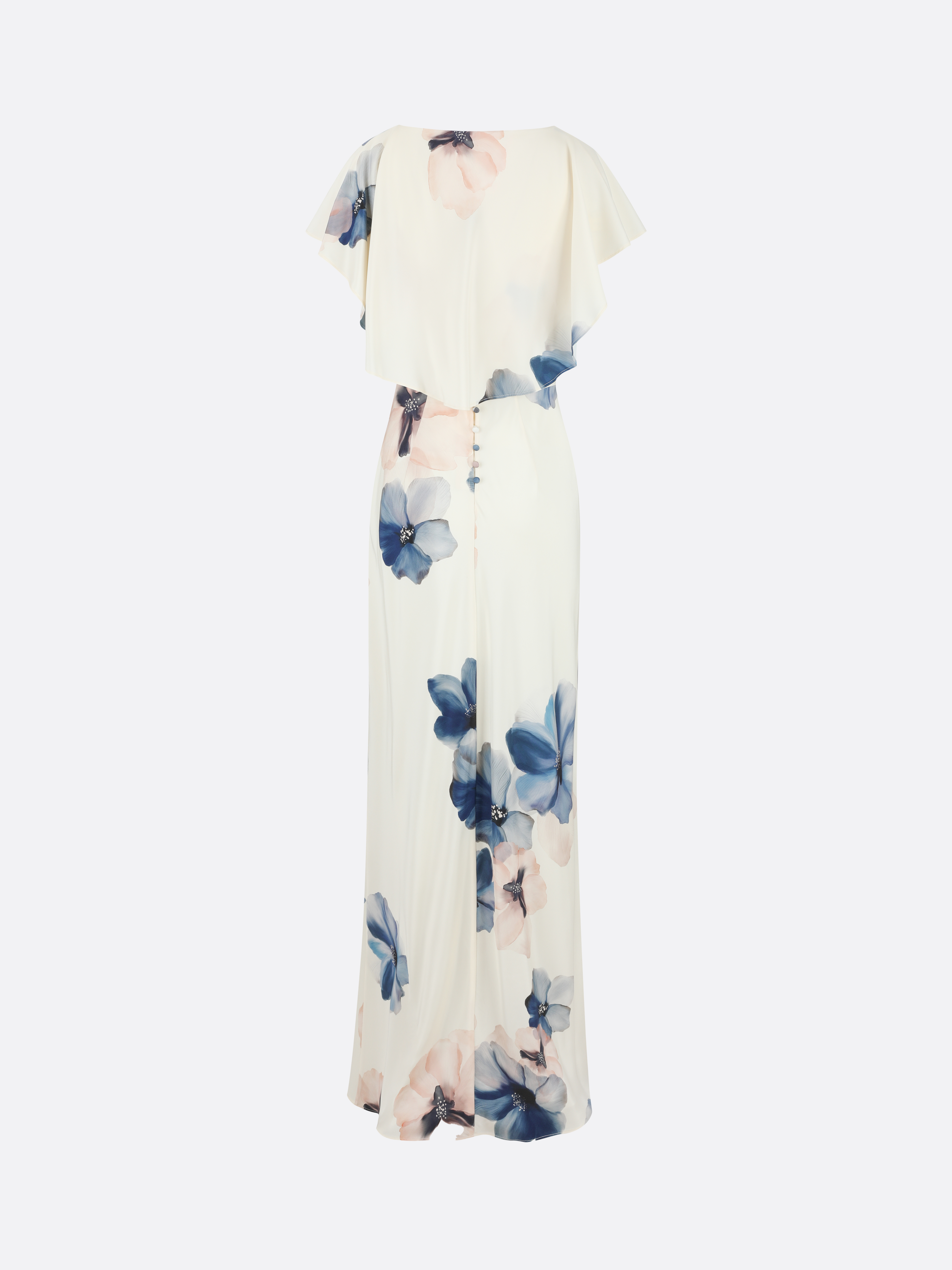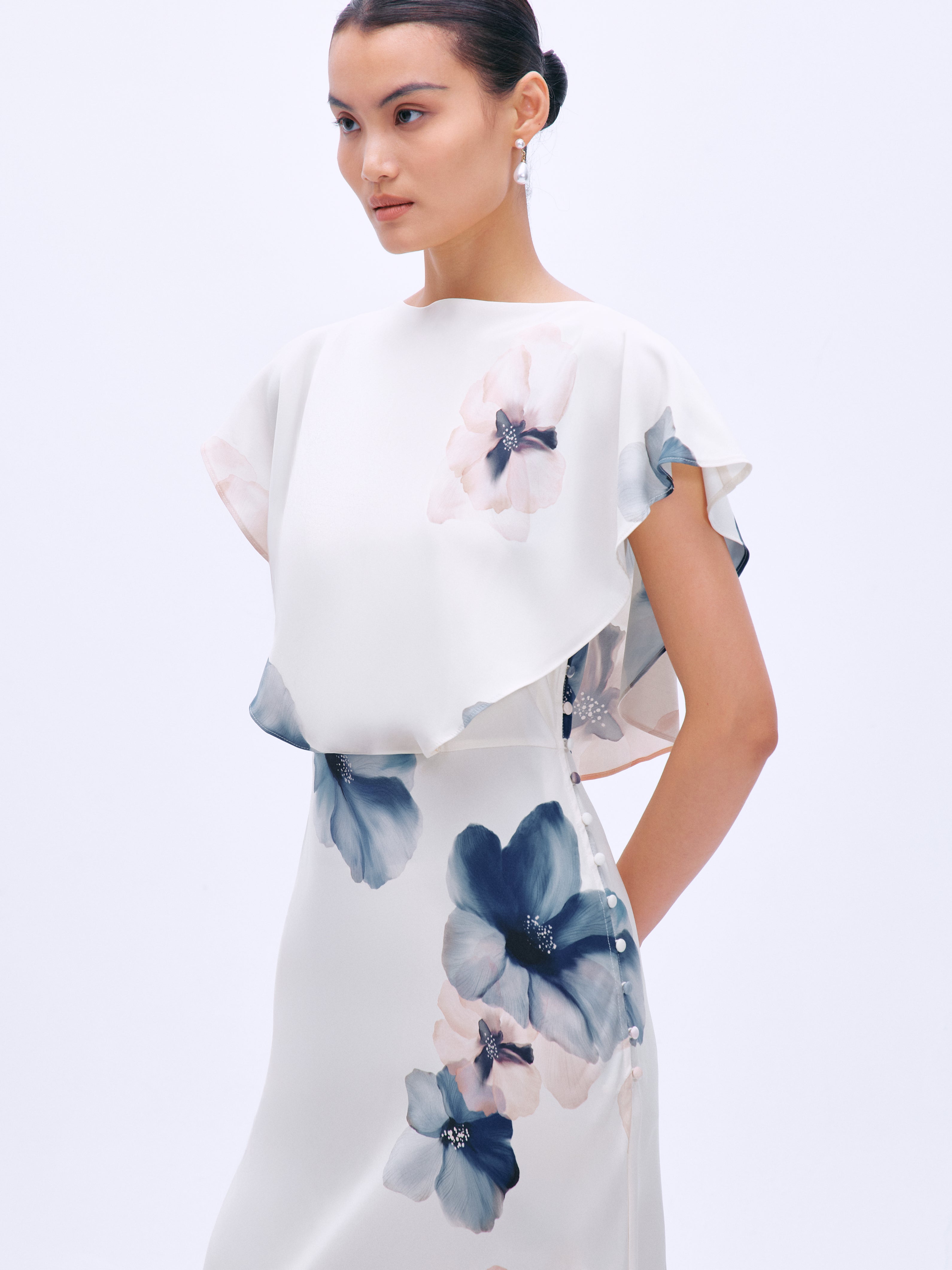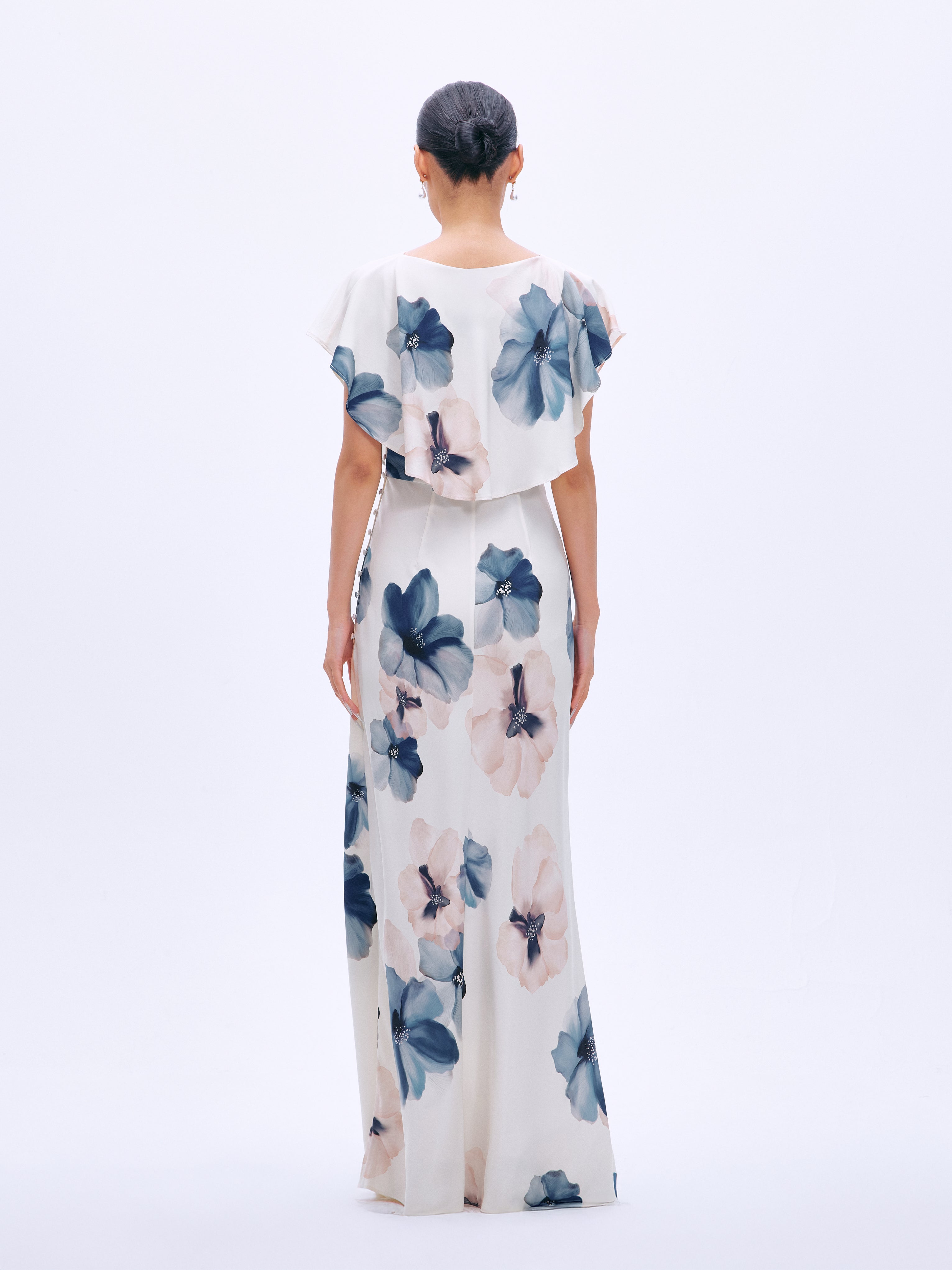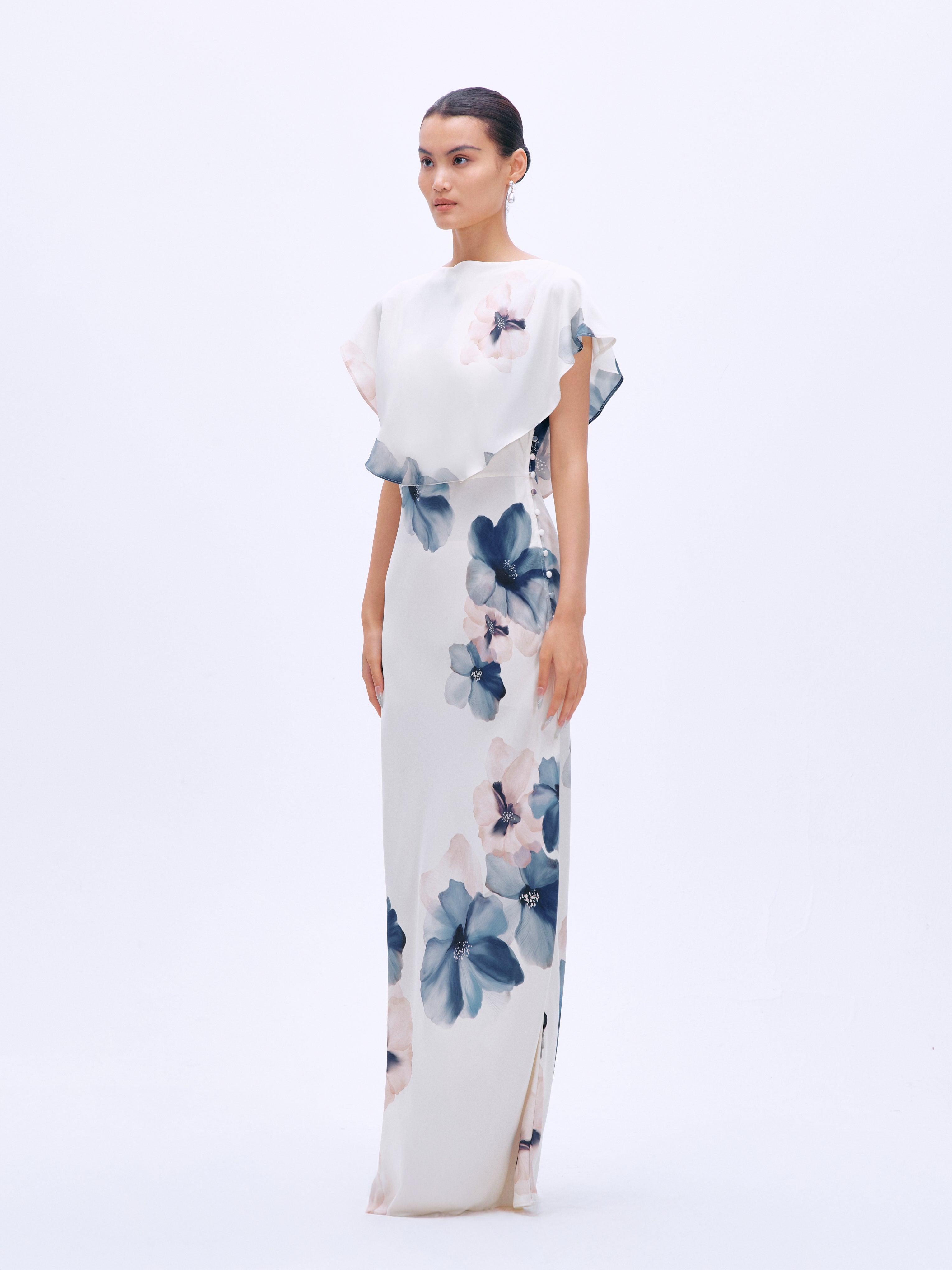 A floor-length dress in the color Petalprint, an original Awaylee hand-painted artwork. Silk viscose with an A-line silhouette and cape-inspired ruffled detailing. Bias-cut craftsmanship with a refined and composed silhouette through a tailored back and structured front panel.
