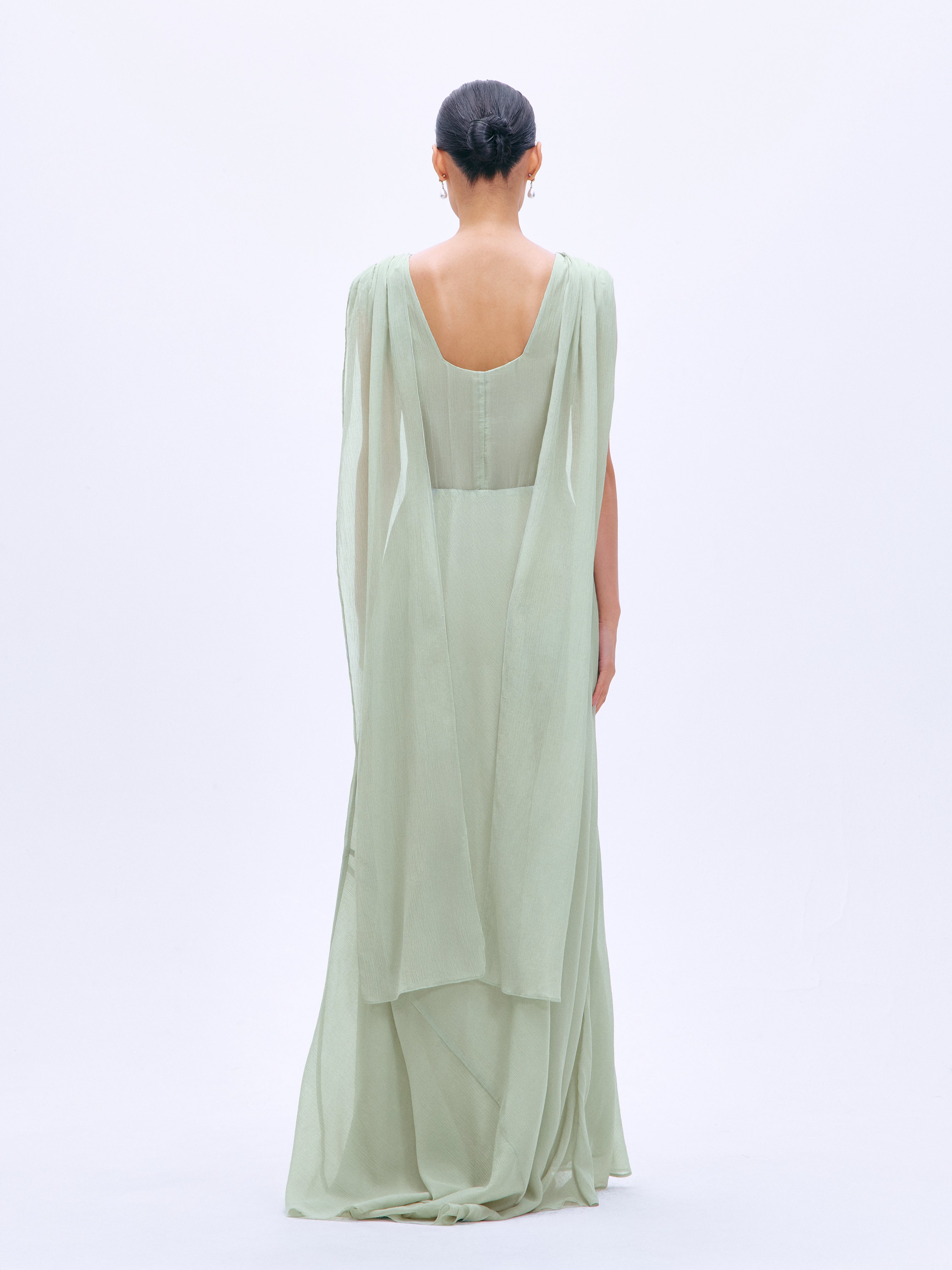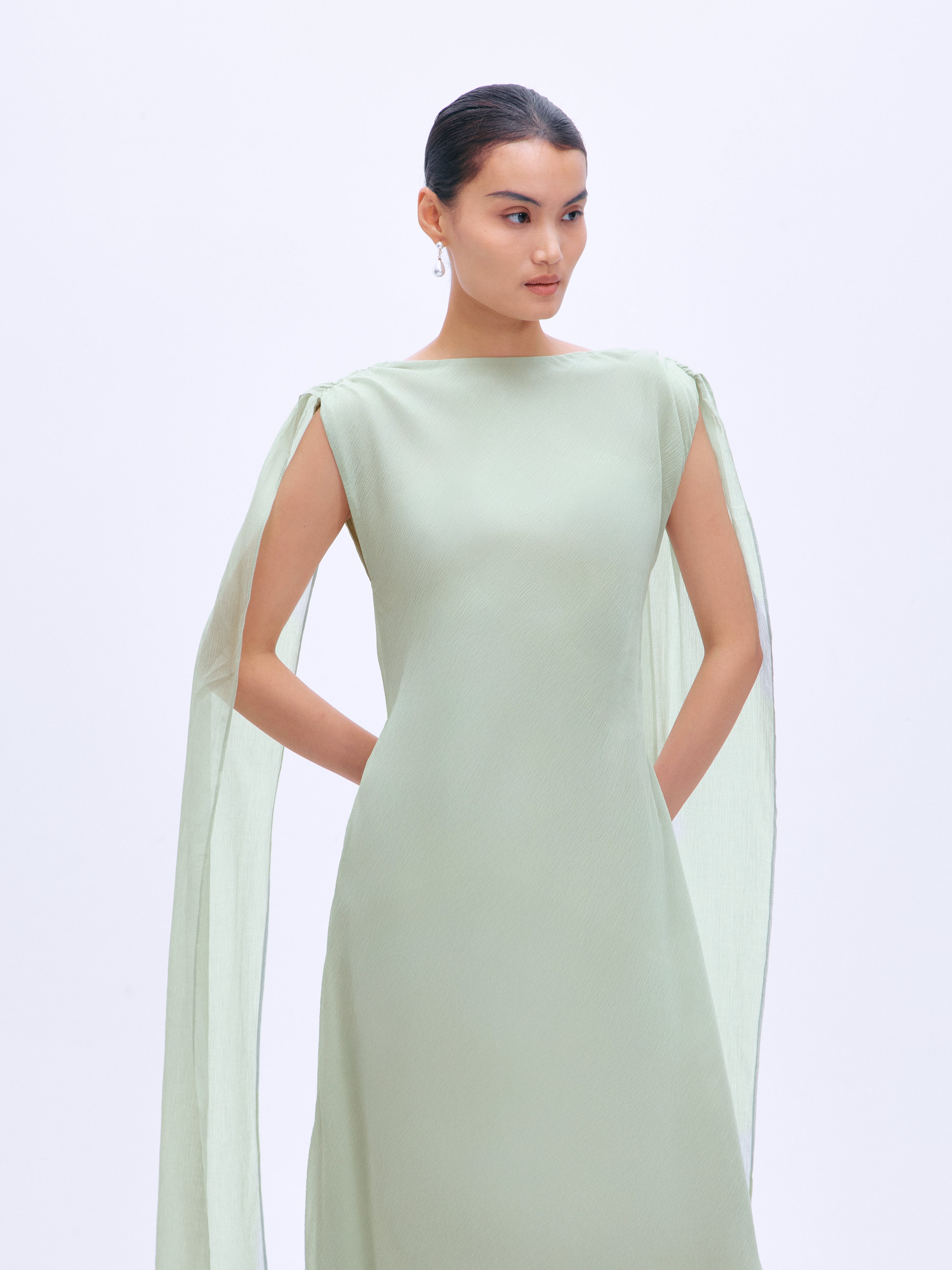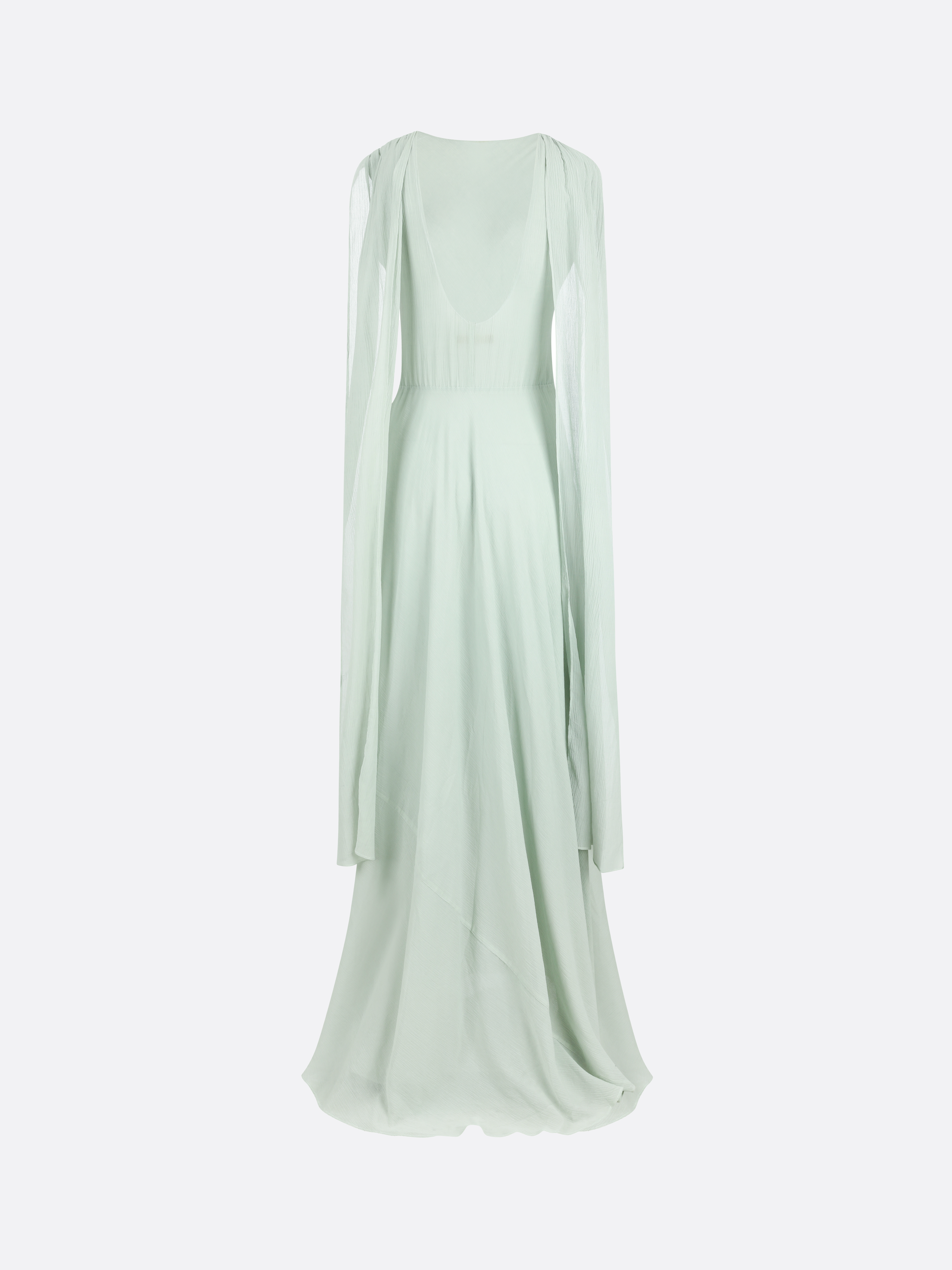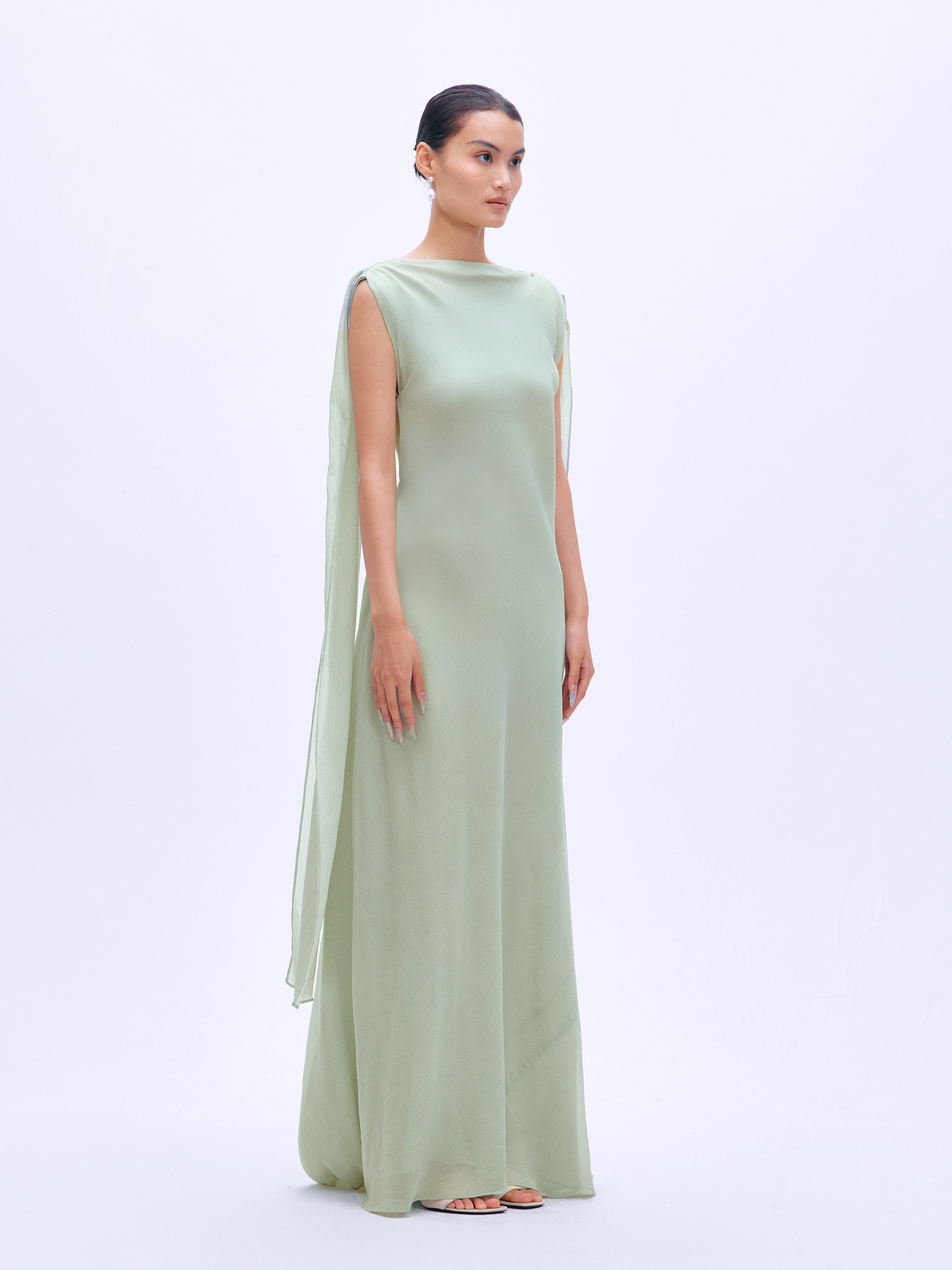 A floor-length dress in the color Serpentine Green. Natural silk cotton doubled layered with crêpe de Chine. A-line silhouette, bias-cut for fluid movement.